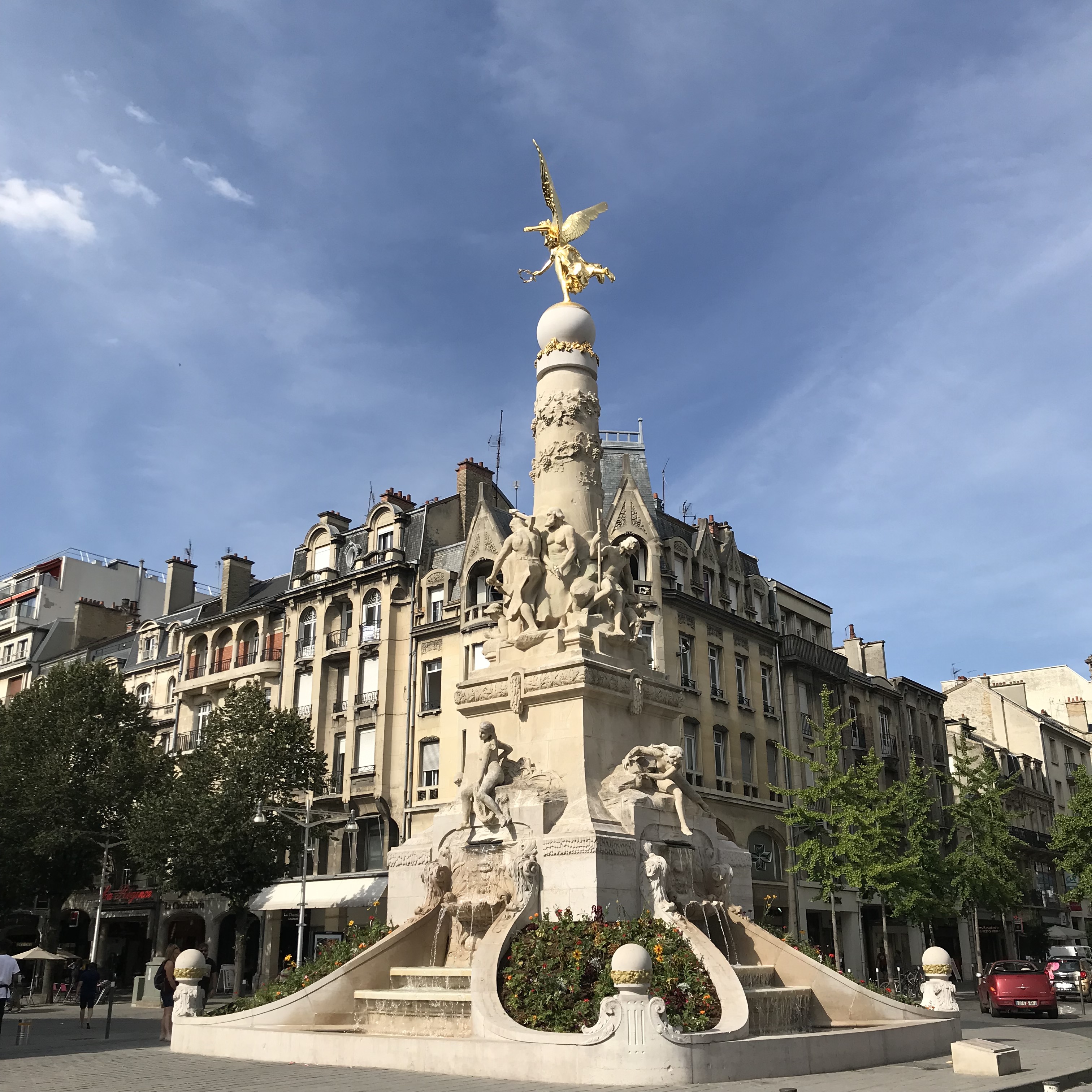 After all that bubbly, it was a thankfully short drive to Reims and our hotel, located in the center of town. We checked in and headed right back out to wander around. Reims is about the same size as Dijon, and is similarly very walkable. We started with an aperitif at L’Apostrophe, which offered great people-watching. I impulsively said, “let’s find me a hat!” So we started looking at shops, though we didn’t find anything I liked or that fit me. But it gave us a purpose and led us further into the city center. We arrived at the Place du Forum to find a free concert in progress, so we stopped to listen to a few songs and take a look around. We sat on the edge of the place’s fountain, hoping the kids wading around wouldn’t splash us (they didn’t). After a dog jumped into the fountain at the urging of its owner, we decided it was time to move on.