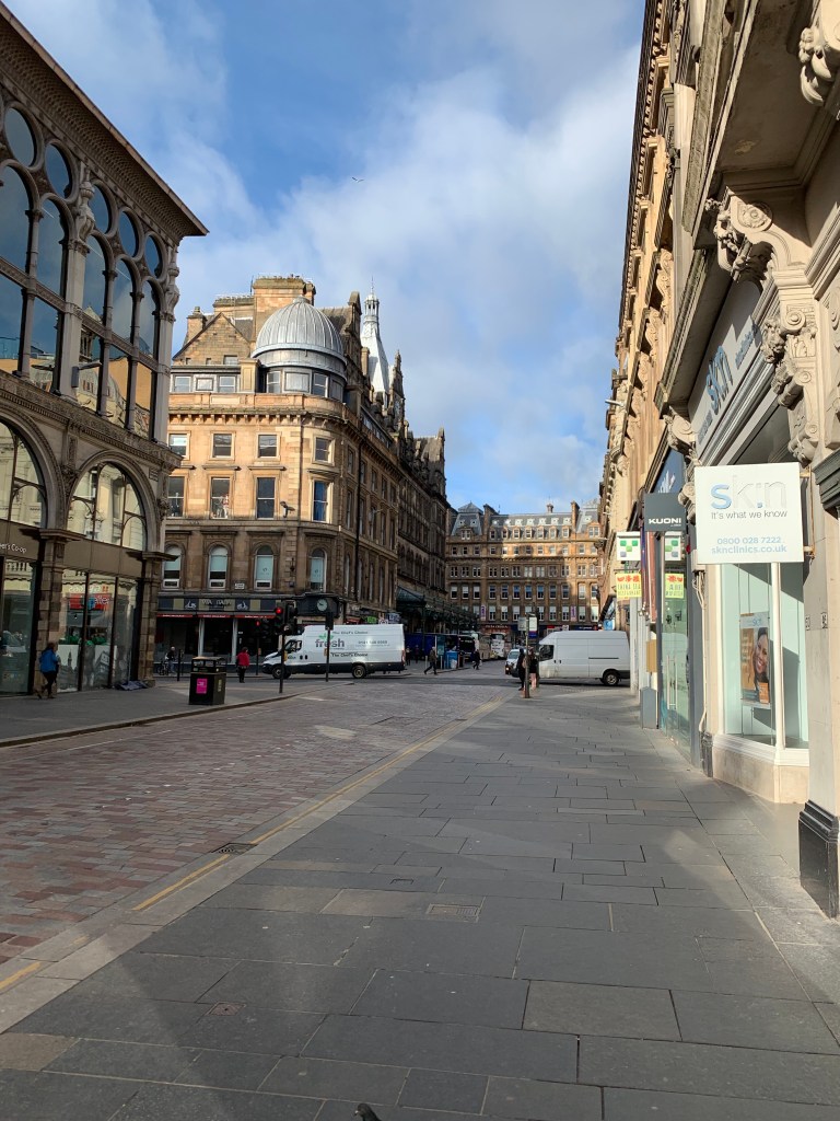 We arrived in Glasgow in late afternoon. Thankfully traffic wasn’t too bad and we were able to park the car without too much trouble. We checked in at our hotel (the Hotel Indigo Glasgow) and then dealt with our first priority: securely packing the whisky we’d purchased over the week for the trip home. We found a shop nearby and managed to get there before they closed. One large box and several meters of bubble wrap later, we were all set.