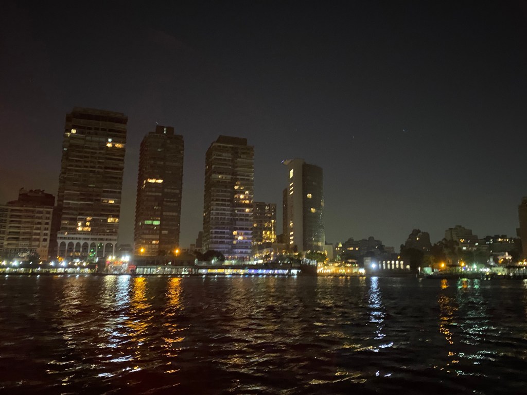 The pyramids are breathtaking, especially close up. Our tour guide, Muhammad, led us to the two largest pyramids and then up to a spot where you could see and take pictures of all three at the same time without seeing modern Cairo behind them. After taking plenty of shots, we went to see the Sphinx and managed to join the last group to get access that day. From there, we went to the river and took a short boat ride up and down the Nile, passing a number of more modern and opulent buildings on either bank. It was a great contrast with the pyramids.