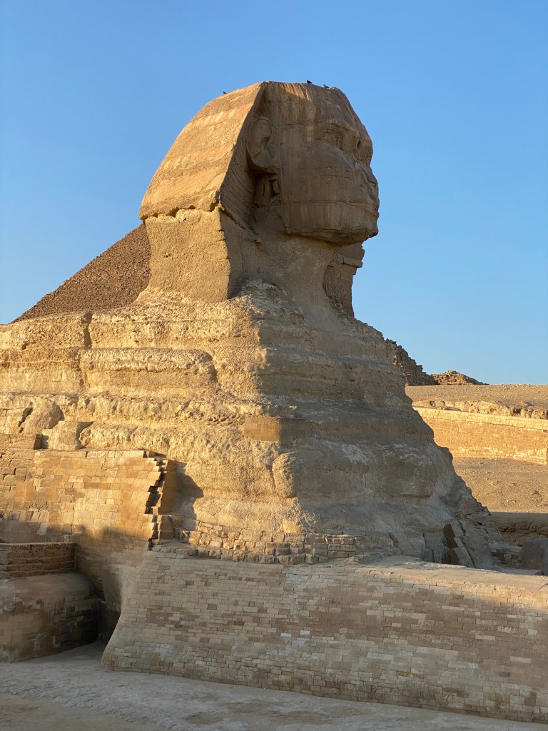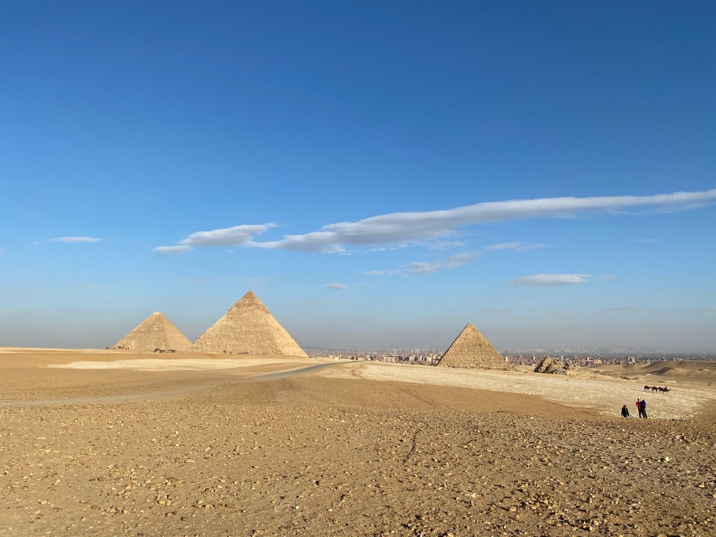 We arrived in Cairo on time, around noon. We quickly cleared passport control and went to the airport hotel to check in and drop our bags. Virginia had used points to rent a suite, which gave us plenty of room to relax. But not immediately – first we had a tour to take. Virginia had also arranged a private tour of the Giza pyramids and the Nile River, and the pyramids close at 4pm. So we were whisked off into heavy traffic by our tour driver as soon as we could get back downstairs.