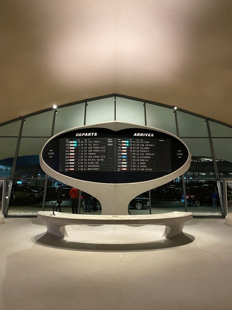 Even having arrived late the night before, we still managed to get up at a reasonable hour. We had over eight hours before our flight and we used a lot of the time to explore the TWA Hotel. Amazingly, JFK didn’t have its own airport hotel until the TWA Hotel opened in May 2019. The hotel was originally the TWA terminal, designed by Eero Saarinen and built in 1962. It was in use until TWA was folded into American Airlines in 2001, after which it sat unused until the hotel was built. The hotel retained many original features, from the space-age swoops to the floor/wall coverings to the departure/arrival boards (now used for fun messages). The lounge turned into a restaurant and the old gate bridges lead to mini-exhibits on Howard Hughes and Eero Saarinen.